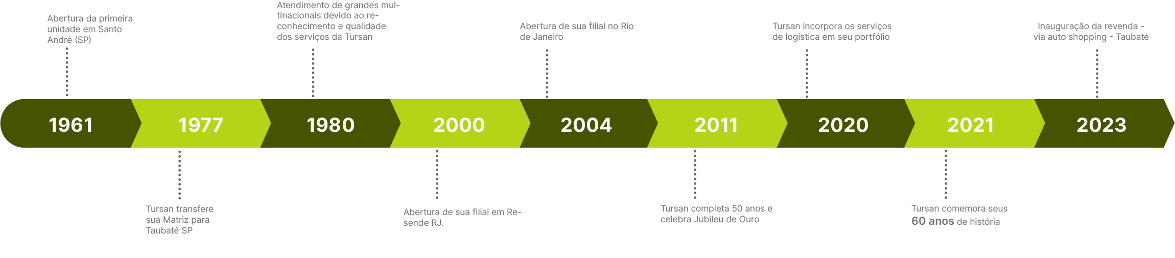 Celebrando 60 anos em 2021, a Tursan renovou sua identidade visual, com veículos adotando uma pintura moderna e vibrante, simbolizando um novo ciclo de inovação e comprometimento com a mobilidade e serviços de qualidade. A história da Tursan reflete sua missão de fornecer soluções de transporte confiáveis e eficientes, vislumbrando um futuro de crescimento contínuo e sustentável.