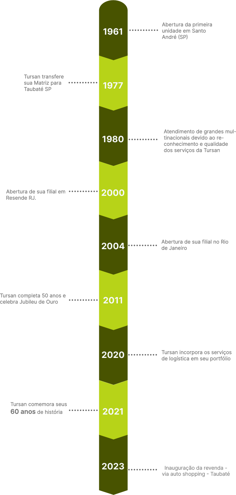 Celebrando 60 anos em 2021, a Tursan renovou sua identidade visual, com veículos adotando uma pintura moderna e vibrante, simbolizando um novo ciclo de inovação e comprometimento com a mobilidade e serviços de qualidade. A história da Tursan reflete sua missão de fornecer soluções de transporte confiáveis e eficientes, vislumbrando um futuro de crescimento contínuo e sustentável.